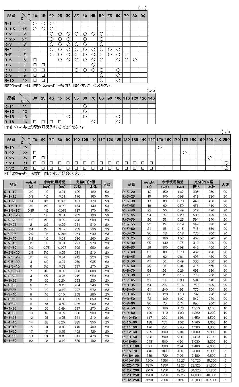 ※○は溶接丸リンクの通常在庫品。