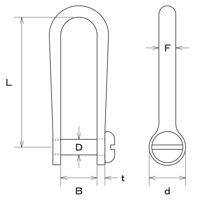 ピンの摘み部分を除いているので、ロープなどが引っかかりにくいです。従来のシャックルより約2倍の長さがあるロングタイプなので、用途が広がります。