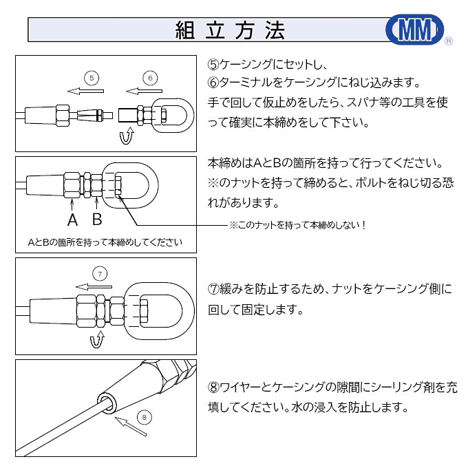 ワイヤーを現場で取付できます。ワイヤーロープの端末に。注意事項:吊具として使用できません。