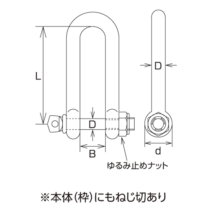 緩み止めナットを使用しています。緩みにくく、且つ施工しやすくスッキリした外観になっています。L寸法が従来のシャックルの2倍の長さです。チェーン・ワイヤー・ロープの端末金具として使用します。本体(枠)にもねじ切りあり ゆるみ止めナット付